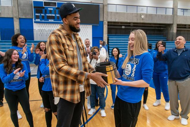 As she stood in front of cameras with her teammates behind her, a loud roar rose up and Bueckers spun around to find Minnesota Timberwolves star Karl-Anthony Towns standing behind her with the Gatorade National Girls’ Basketball Player of the Year Trophy.