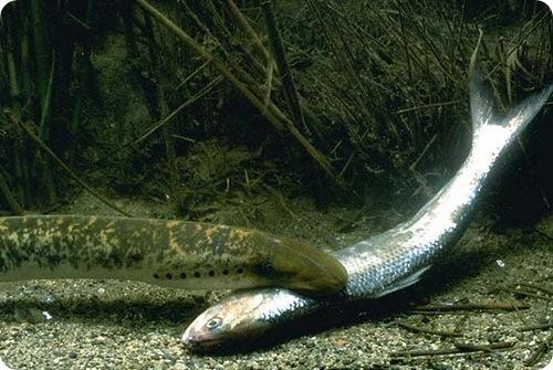 LAMPREY. A species under threat of extinction. Reaches a length of 120 cm and weight 3 kg. Spawns in June and early July in rivers. The male builds a nest with a diameter of about 50 cm and protects it. After spawning, producers die. The larvae live in the river is 5-6 years, after metamorphosis, the young lamprey migrate down to the sea, sea a period of about 3 years. In the sea, attach themselves to the fish (the external parasites of larger fish) — cod, flounder, etc.