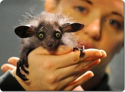 THE AYE-AYE. RECONOZCA. Reconozca or Madagascan Aye-Aye, a mammal of the suborder prosimians; the only member of the family rokonok. The body length of 40 cm, 60 cm tail Head large, muzzle short; ears large, leathery. The tail is fluffy. Hair color from dark brown to black.