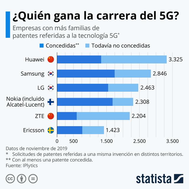 La siguiente infografía de Statista muestra las empresas con más familias de patentes presentadas sobre la tecnología 5G a fecha de noviembre de 2019. El gigante chino Huawei es el número uno en solicitudes, con 3.325 registradas en noviembre de este año, según estimaciones de la consultora IPlytics. De ellas, han sido concedidas unas 1.400.