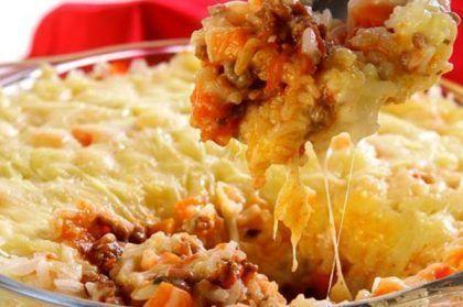 - coloque uma camada de arroz, uma de queijo tipo mussarela,