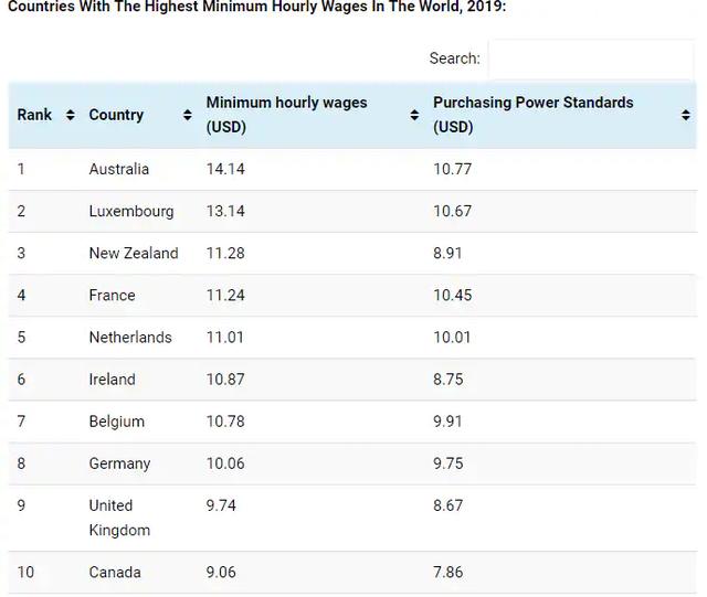 According to CEOWorld Magazine, Australia tops the list with an hourly minimum wage of $14.14 followed by Luxemborg which pays $13.14 per