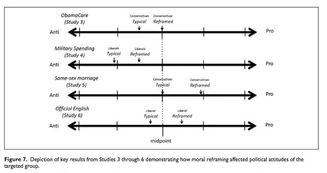 The chart below shows how well the moral reframing worked for each policy area in Willer’s study. To be clear, there's only so much that reframing in terms of values can do: It can't turn an anti-Obamacare conservative into a proponent, but it can soften his stance and get him to listen to counterarguments.