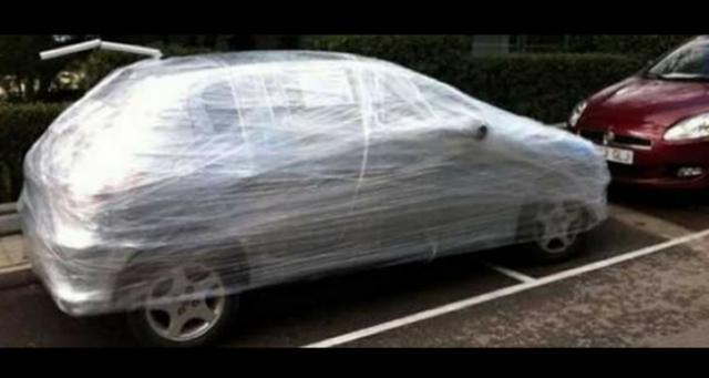 Hoje em dia, estacionam até em cima da linha branca, ocupando 2 vagas! Alguém deixa o carro invadindo levemente a vaga ao lado e aqui está o resultado: um carro completamente embalado com plástico filme. Uma quantidade incrível que até faz pensar que a vingança já vinha sendo planejada a tempos. “Desculpe, você pode me emprestar um pouco de plástico filme?”