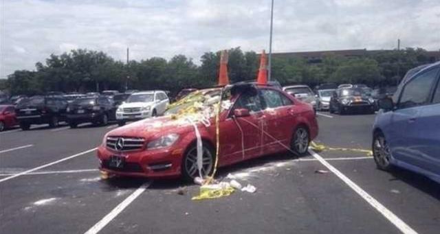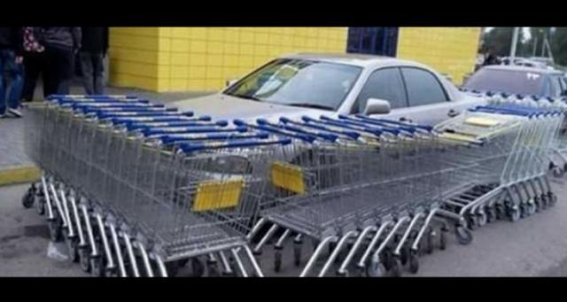 Não dá para entender muito bem o que houve aqui. Que tenha sido uma brincadeira, uma vingança pelo fato de o carro estar onde não deveria estar, ou apenas um gesto casual de algum maluco, não importa. O fato é que esse carro foi cercado de muitos carrinhos de supermercado e se já é um saco quando alguém abandona um único carrinho atrás do seu carro, imaginem essa quantidade!