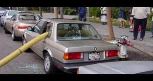 Os bombeiros se mostraram duplamente mestres neste caso. Quando chegaram ao local da emergência, encontraram uma BMW estacionada perto demais do hidrante. Em vez de perder tempo precioso chamando a polícia ou o guincho para remoção do inconveniente veículo, eles tiveram a genial idéia de destruir as janelas para criar a passagem da mangueira, simples assim.