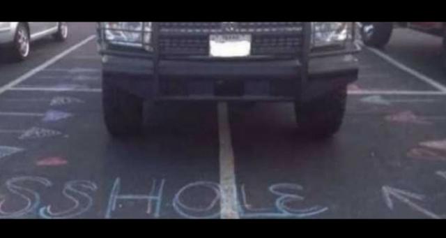 Continua sendo um mistério da natureza humana o que leva um indivíduo a estacionar o carro entre uma vaga e outra. Neste caso, esbarramos com o sobrenatural. Uma camioneta ocupandonada mais, nada menos que 4 vagas. Mas alguém que passou por ali com giz colorido quis homenageá-lo fazendo uma obra de arte. Como? Desenhando no chão várias setas para evidenciar a “mancada” e um único “adjetivo” escrito: “Asshole” cuja tradução literal do palavrão fica vetada para menores.