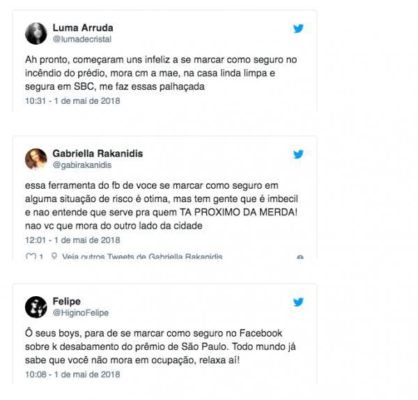 No Facebook, muita gente, mesmo que longe do local ou não ligada à ocupação do prédio, usou um recurso para se marcar como “seguro”. A ferramenta, entretanto, costuma ser usada para tragédias de maior magnitude, como atentados terroristas. Por isso, a atitude tem rendido críticas no Twitter.