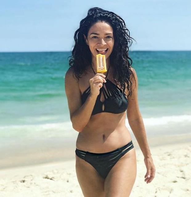 A boa forma da atriz no auge dos seus 55 anos chama atenção na web."Recompondo as energias!! Praia, sol e sorvete!!! Como eu amo isso", declarou a musa na legenda da rede social.