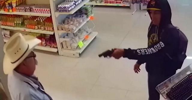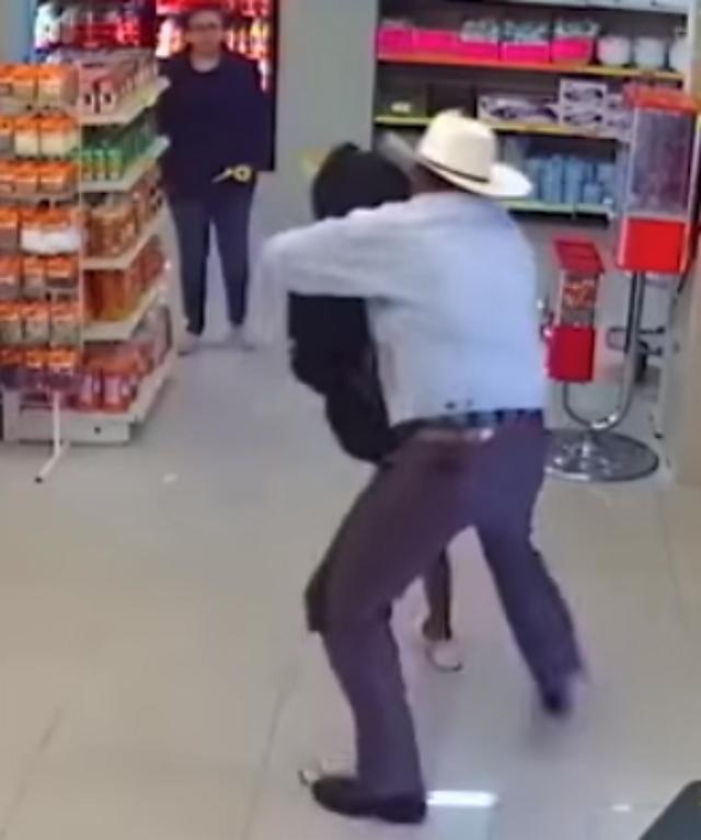 He first points the gun at the woman behind the checkpoint counter before he turns his attention to the front of the cash register where an older gentleman who kept a gray moustache and wore a cowboy hat was standing. Little did he know that this man was going to give him more than he bargained for.