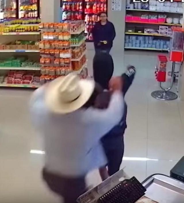 When the gunman is next seen, he had somehow managed to slip free of his sweat shirt and hoodie and is now shirtless. He tried to make his way to the door but did not make as the cowboy and two butchers catch him just before he reached the exit of store and pinned him down on top of metal shopping baskets.The police arrived the butcher shop about ten minutes after the incident and took the would -be robber into custody.