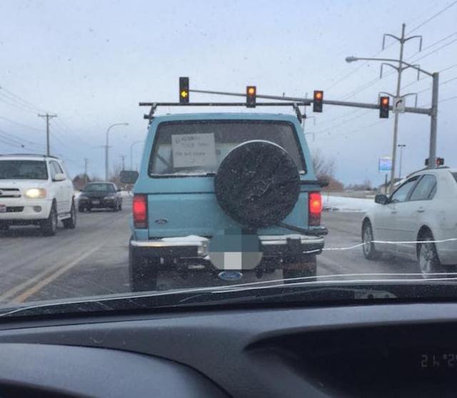 "As I was pulling into work, I was following this car. The sign in the back window said, 'Learning stick sorry for any delay.'