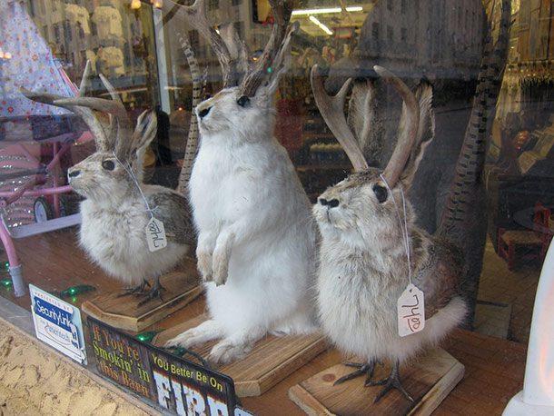 Tall tales spoke of a species of “killer rabbits” with deer antlers known as The Jackalope. Many people claimed and believed that the female Jackalope could be milked while asleep and that its milk could be used for medicinal purposes. Jackalopes were believed to efficiently mimic any sound, including the human voice. It has since been established, however, that no such creature exists and that stories of Jackalopes may have been inspired by rabbits infected with the Shope papilloma virus which causes antler-like tumors in various parts of a rabbit’s body.