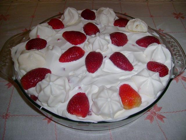 Merengue de morangosIngredientes:2 caixas de morangos lavados e picados (reserve alguns para decoração)500 ml de creme de leite fresco batido em ponto de chantillysuspiros quebrados grosseiramente (reserve alguns para decoração)Preparo:Bata o creme de leite em ponto de chantilly e faça camadas com ele, os morangos e os suspiros, terminando com chantilly.Decore com morangos e suspiros e leve para gelar.