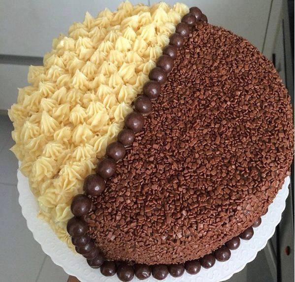 11. Chegou a hora de fazer o acabamento. Você pode usar chantilly branco e chantilly de chocolate para decorar esse bolo com dois sabores.