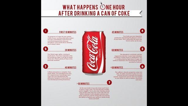 60 minutes: As the rave inside of you dies down you'll start to have a sugar crash. You may become irritable and/or sluggish. You've also now, literally, pissed away all the water that was in the Coke. But not before infusing it with valuable nutrients your body could have used for things like even having the ability to hydrate your system or build strong bones and teeth.