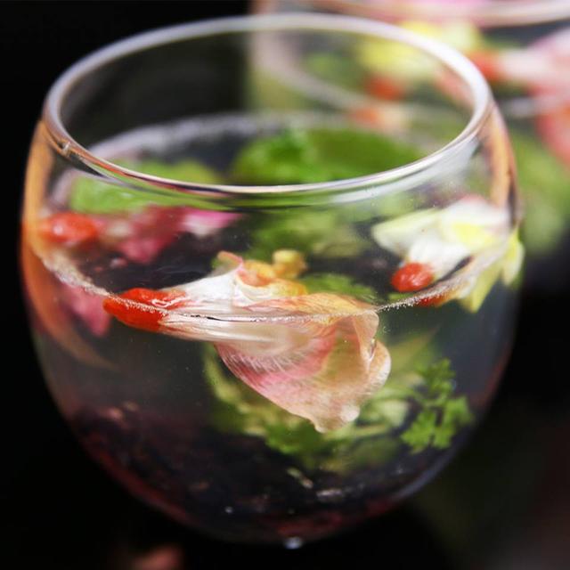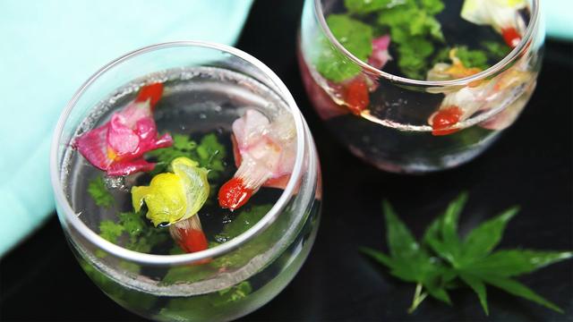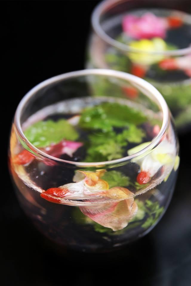 1.Rehydrate goji berries in warm water. Cut stem-end of edible flower and insert goji berry.