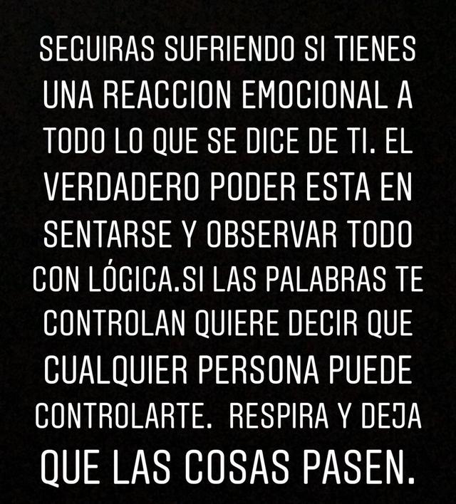 “Você Seguirá sofrendo se tem uma reação emocional sobre tudo o que dizem ao seu respeito. O verdadeiro poder está em sentar e observar tudo com lógica. Se as palavras controlam você, quer dizer que qualquer pessoa pode te controlar. Respire e deixe que as coisas passem“, publicou Borja.