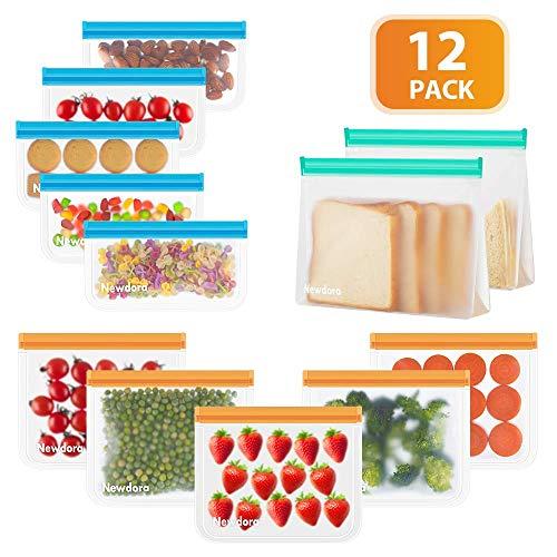 Newdora Bolsas de Silicona Reutilizables 12 Pack, Bolsas Congelar Reutilizables para Almacenamiento de Alimentos, Bolsas de conservación, Bolsas Reutilizables para Fruta Sándwiches Verduras, Sin BPA