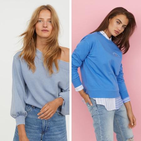 ¿Quién dijo que las sudaderas no son para la oficina? Estas dos opciones prueban lo contrario. Y prueban también lo muchísimo que triunfa en azul claro esta temporada. En formato cuello bardot (14,99 euros) e ideal para combinar con las blusas lenceras; o de estilo universitario (9,99 euros) con una camisa debajo.