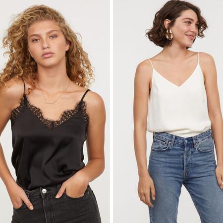 Debajo de estos jerséis es importante llevar tops muy chic, por si la calefacción está demasiado alta. O, en el caso de los jerséis de pico con escote marcado, para dejar entrever un detalle lencero y sexy bajo la prenda. Para ello no hay nada como las blusas de tirantes, en negro y repleta de encaje (14,99 euros) o en total white satinada (14,99 euros)