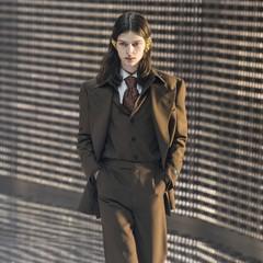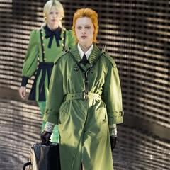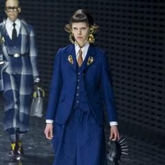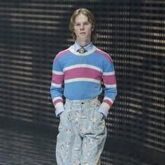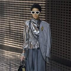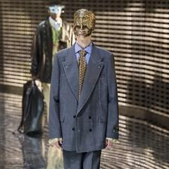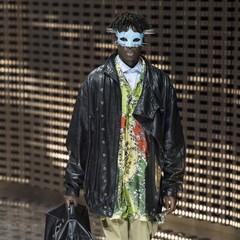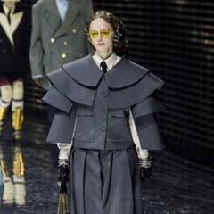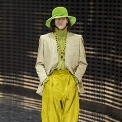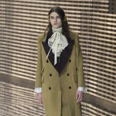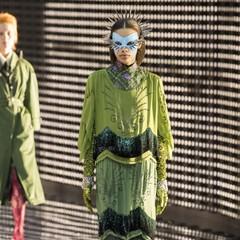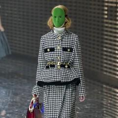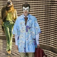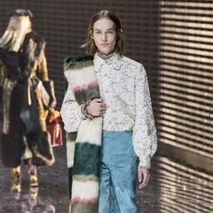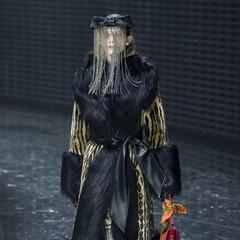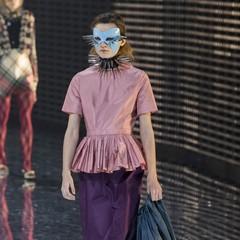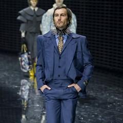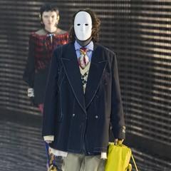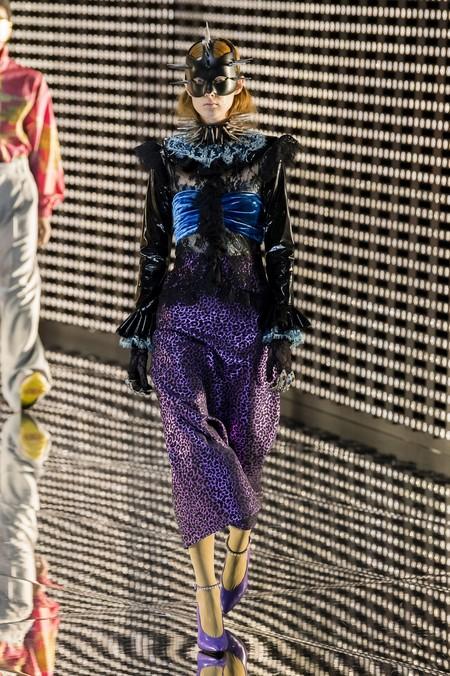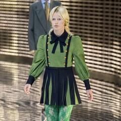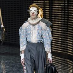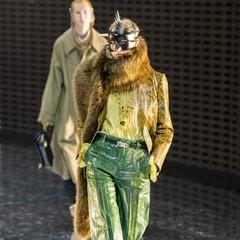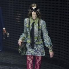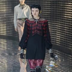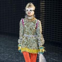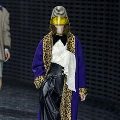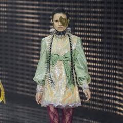 Gucci vuelve a darnos escalofríos con un baile de máscaras y pinchos en el que lo freak es observado desde el romanticismo. Se llevan las mezclas, las siluetas oversize, y las prendas con acabados lujosos: guateados, prints de serpiente, sedas, cueros moldeables,... Vuelven las hombreras para dibujar siluetas extremas, el barroquismo de los cuellos y las mangas con volantes y puntillas y un estilo retro, etéreo y colorista.