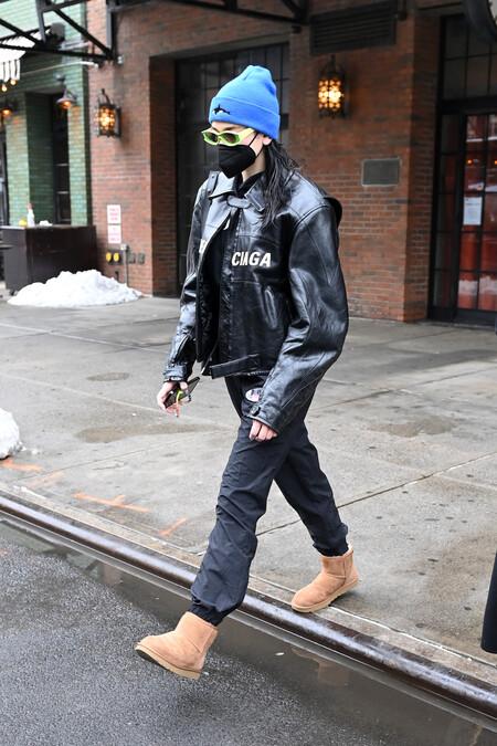 Dicen que los detalles marcan la diferencia y así lo vemos con este estilismo. Con prendas de color negro (la chaqueta motera de Balenciaga no pasa desapercibida), Dua adereza este estilismo con un beanie en color azul eléctrico y unas gafas de sol verdes de Loewe. Sus botas Ugg auguran el retorno de este calzado que tanto triunfó hace más de diez años.