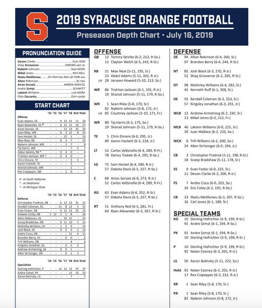The 2019 Syracuse Orange football depth chart has been unveiled today, just ahead of this week’s ACC media days. So first and foremost, check that out below: