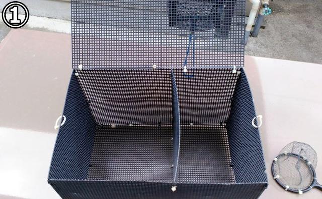作り方は、エビネットは百円均一に置いてある園芸用のネットを使用。それをクーラーの大きさに合わせてカットし、ネットの穴に結束バンドを通して組み立てる。私の場合、エビが逃げないようにふたを付け、また大きさによって分けるために2部屋にしている。ふたは取り出し時は不便だが、他の場所からそのままクーラーに入れることを優先している。