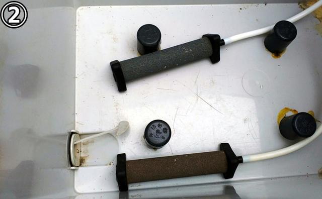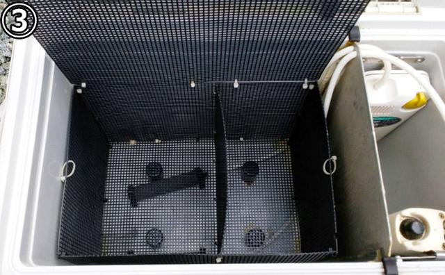 シラサエビは元気な状態で現地まで持っていきたいもの。私の場合は20Lのクーラーをベースに、ブクのスペースを作るためにアルミの板を切って仕切りを入れている。外にブクをセットすると、外の空気を中に入れることになり、水温が上がってしまうからだ。エアーが出る部分(ストーン)は、上からエビネットを置いてもいいように、塩化ビニールパイプのふた(4~5cm)を4個接着して隙間を作っている。