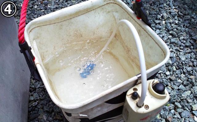 4.小出し用には水くみバケツを使用。こちらにもブクをセットしてクーラーの水を少しずつ入れて使用する。