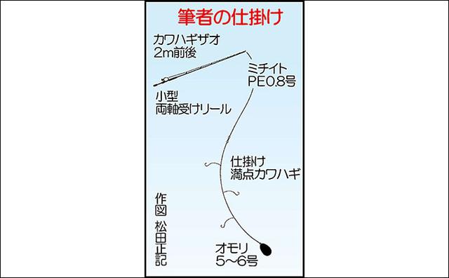 龍ヶ岳一帯のカワハギの釣況をたずねると「樋島や小屋河内漁港がお勧め」と言う。早速、現地へ向かい、外波止の内側に構えて釣り始めた。