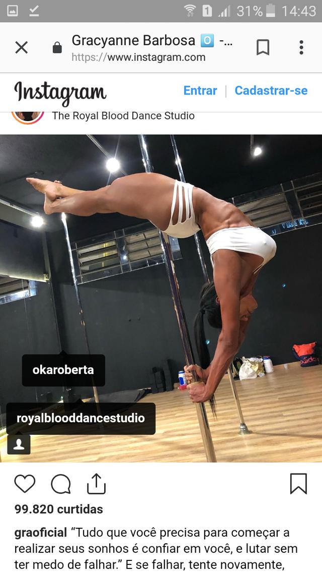 Gracyanne Barbosa usou o Instagram mais uma vez para compartilhar um momento de sua rotina fitness. Na segunda-feira (10), a musa postou uma pose inusitada na aula de pole dance.