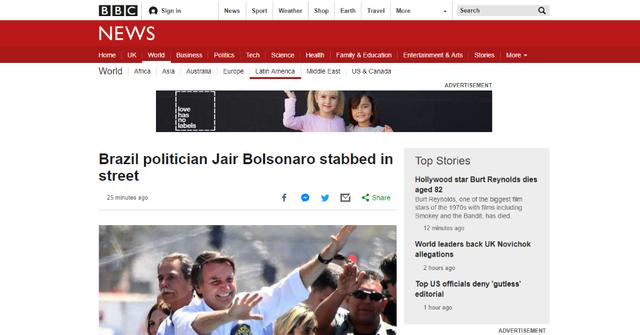 Veículos de todo o mundo noticiaram o ataque a faca sofrido por Jair Bolsonaro nesta quinta-feira (6).