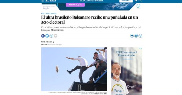 "O candidato com mais intenção de voto e com mais rejeição entre o eleitorado foi atacado em um ato de campanha no estado de Minas Gerais", escreveu o espanhol El País.