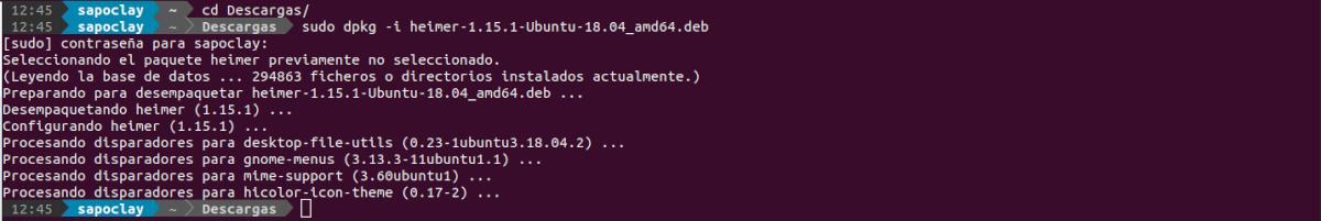 Los usuarios podemos descargar el archivo .deb de Heimer desde la página de lanzamientos del proyecto. En el momento en el que escribo este artículo el nombre del archivo a descargar es ‘heimer-1.15.1-Ubuntu-18.04_amd64.deb‘. Terminada la descarga, no habrá más que abrir una terminal (Ctrl+Alt+T) y movernos hasta la carpeta en la que tengamos guardado el archivo descargado: