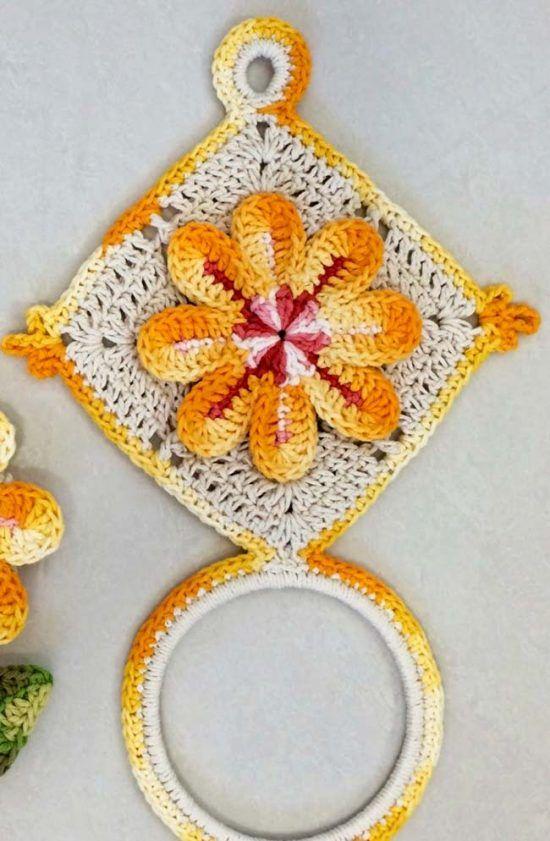 Imagem 28 – Pano de prato de crochê colorido e florido ganhou um suporte de cor viva.