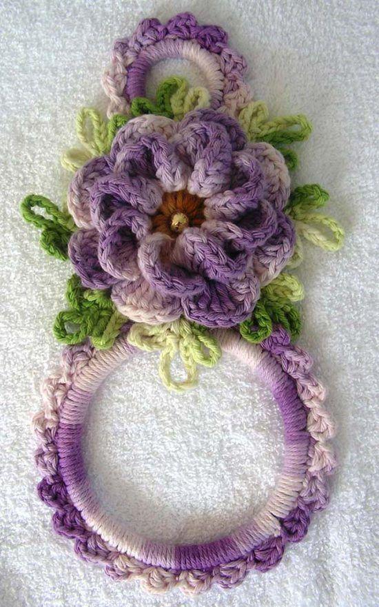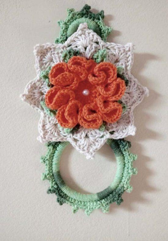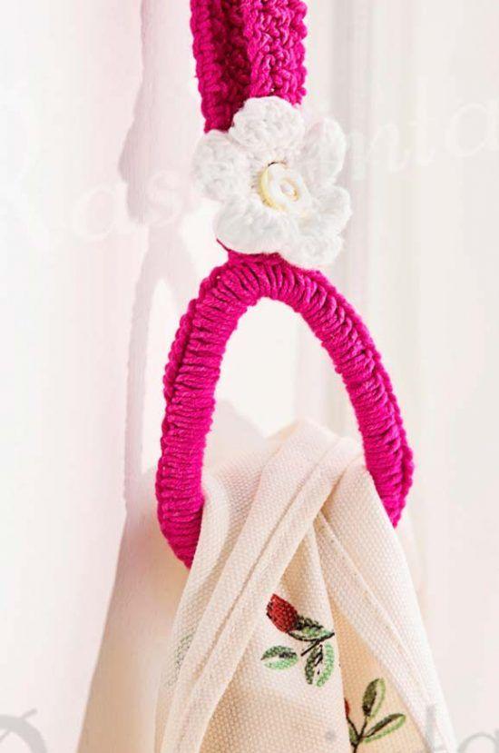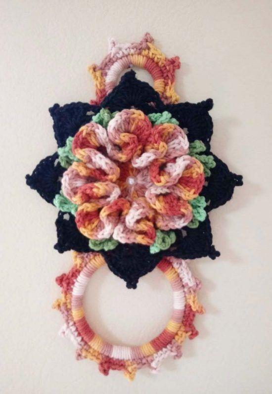 Imagem 11 – Porta pano de prato de crochê de flor roxa com barrado na argola.