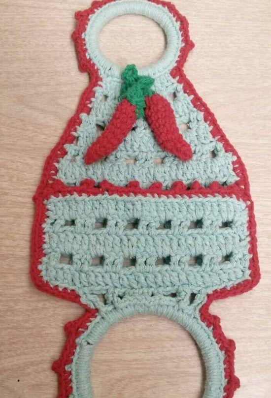 Imagem 16 – Porta pano de prato de crochê decorado com pimentinhas vermelhas.