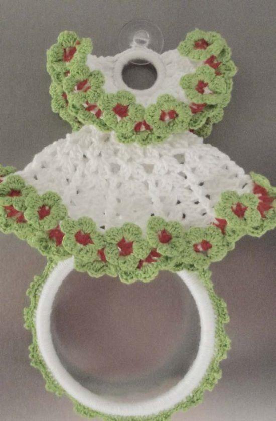 Imagem 30 – Porta pano de crochê em formato de vestidinho branco e barradinho verde.