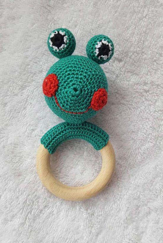 Imagem 31 – Porta pano de prato de crochê de sapinho com argola de madeira.