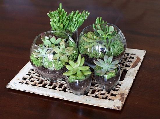 Misture potes de vidro de diversos tamanhos e formatos para criar um terrário super charmoso.