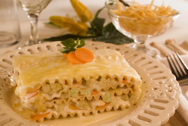 Faça camadas de lasanha, molho, couve-flor, cenoura, mussarela e queijo parmesão. A última camada deve ser de lasanha, molho, mussarela e queijo parmesão.