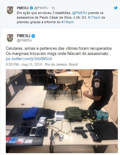 Em seu twitter, a corporação informou que "os marginais trocavam mensagens onde falavam do assassinato" do MC.