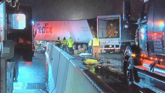 At least five people were killed and scores more injured Sunday in a massive crash that involved two tractor trailers, a tour bus and passenger vehicles and shut down almost 100 miles of the Pennsylvania Turnpike in both directions. The crash occurred at about 3:30 a.m. ET Sunday near mile marker 86 on the westbound side of the highway. Pennsylvania State Police spokesperson Stephen Limani said the bus was struck by two tractor-trailers, then another truck and a passenger car. Photos from the scene show the bus on its side, along with battered Fedex and UPS trucks with packages scattered on the highway. The National Transportation Safety Board said it was investigating.