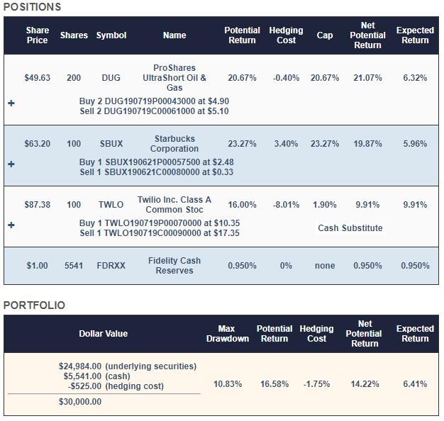 Because this portfolio had a lower dollar amount ($30,000 is the minimum size of Portfolio Armor’s hedged portfolios), it only included two primary securities: Starbucks (SBUX) and DUG. After initially allocating roughly equal dollar amounts to each, the site rounded down each dollar amount to get round lots to minimize hedging cost. Then it used Twilio (TWLO) – tightly hedged, with a collar capped at the then-current money market yield – to absorb most of the leftover cash from the rounding down process.