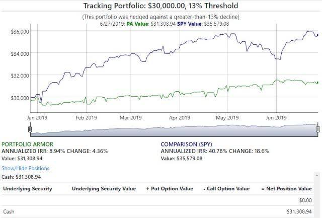 In that context, this is the hedged portfolio Portfolio Armor presented to an investor who indicated he had $30,000 to put to work but wanted to strictly limit his downside risk to a decline of no more than 13% over the next 6 months: