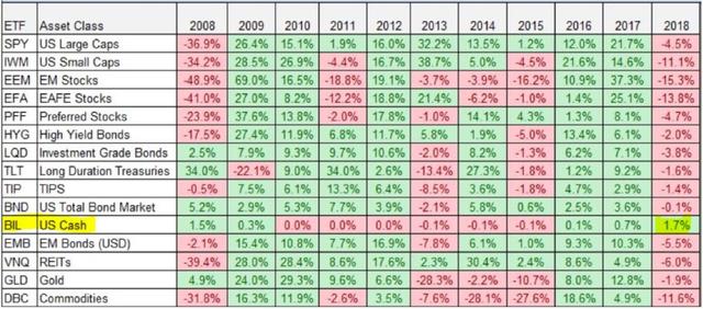 In 2018, our fund was down -1.2% net of fees and expenses vs. a decline of -4.4% for the S&P 500. Please check your individual statements as your actual performance may differ depending on the date you became a Partner. If you look at the chart below, 2018 was a negative year for every single asset class with the exception of stuffing cash under your mattress. It was also the first negative year for US large cap stocks since 2008. International developed markets where down -14%, emerging markets where down -15% and most mutual funds and hedge funds lost money in 2018.