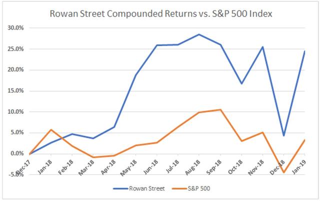 However, as a limited partner in Rowan Street Capital (RSC), if you went on vacation to a deserted island for the past 13 months (as of this letter) without access to the internet or any kind of news flow, you would have come back to our fund being up +24.4% (gross of fees). The general market, as measured by the S&P 500 index, was up only +3.3% during the same time period. The chart below shows the volatility that took place in the interim, with a big drop in December and a significant rebound in January, eliminating December losses for our fund. We believe this chart is a more meaningful presentation of the value-creation that Rowan Street has experienced as opposed to just referring to 2018 numbers, which do not tell the whole story.