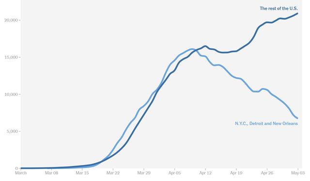 In fact, excluding the progress in three hotspots (NYC, Detroit, and New Orleans), new cases are continuing to rise, as you can see in the chart below from the New York Times (yes, some of this is due to more testing, but only a small part – the overall trend is clear and real):